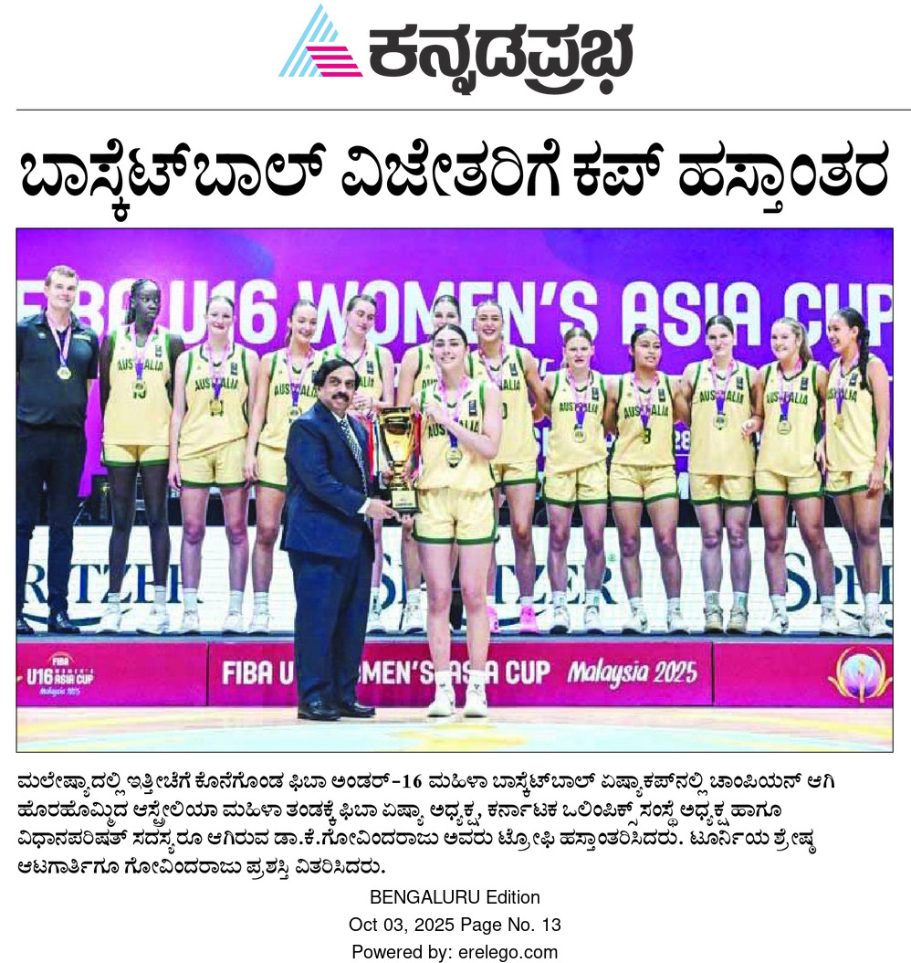 We are happy to inform you that Dr. K. Govindaraj, President FIBA Asia presented the trophy to the Australia Men Basketball team which won the FIBA Asia Cup Basketball Championship finals held at Jeddah, Saudi Arabia on Sunday, the 17th August 2025 late evening. In the finals, Australia beat China by 90-89 and also congratulations to the champions.