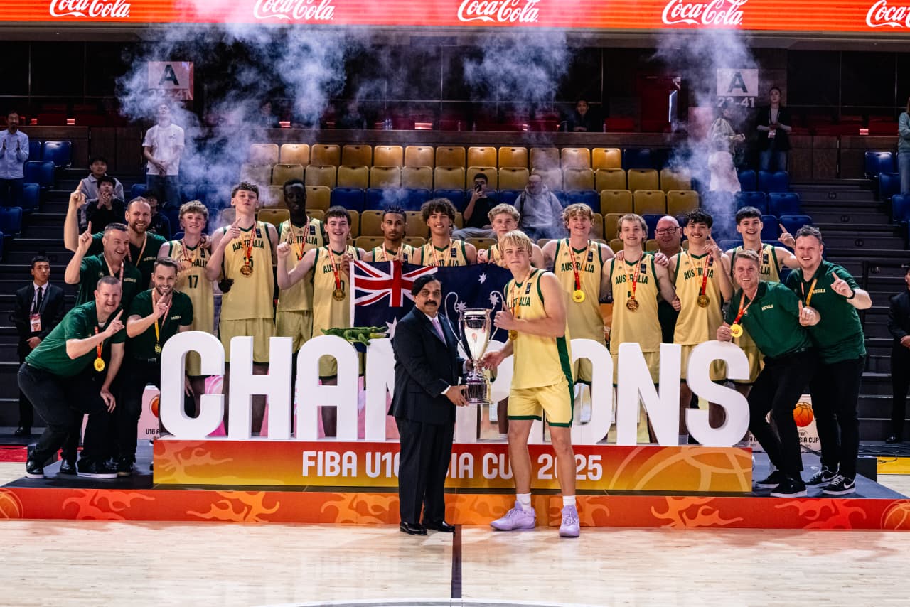 Dr. K. Govindaraj, President of FIBA Asia & KOA presenting the Championship Trophy to Team Australia at the FIBA Women’s Asia Cup 2025 Final in Shenzhen, China. Australia clinched the title with a thrilling 88-79 win over Japan! 🇦🇺🇯🇵